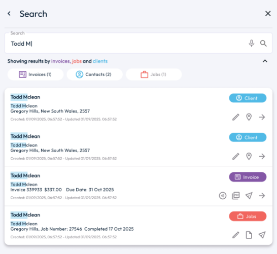 Need to send a payment link, call the client, or check their job status? No more clicking through modules or digging through lists, just tap the icon beside the result and it’s done.