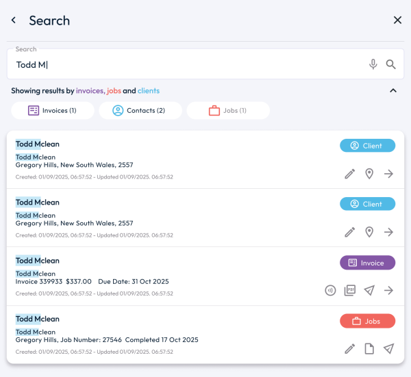 In Jobs, the new search panel also doubles as a History drawer, showing all previous jobs, forms, invoices, notes, and more connected to that client. With user permissions fully considered, your team can see the right history in seconds without digging through multiple screens.
